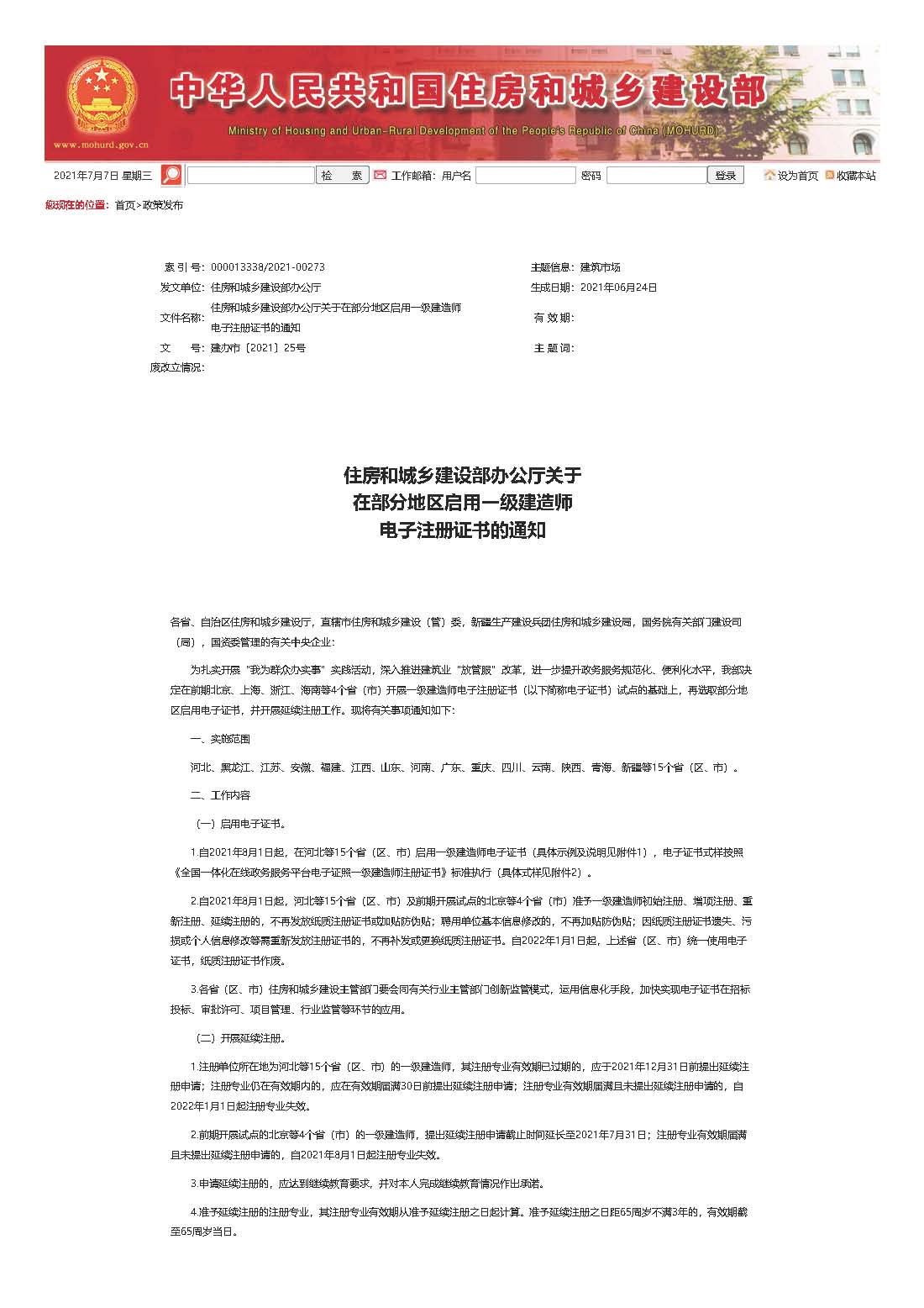住房和城鄉建設部辦公廳關于 在部分地區啟用一級建造師 電子注冊證書的通知